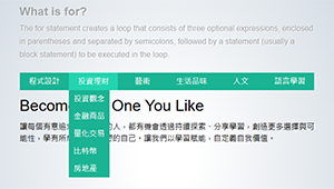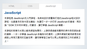 一種進階、直譯的程式語言,支援物件導向、指令式,以及函式語言的程式設計。本門課程著重在 DOM、事件的處理,並深入淺出的介紹變數觀念及其應用的方式。